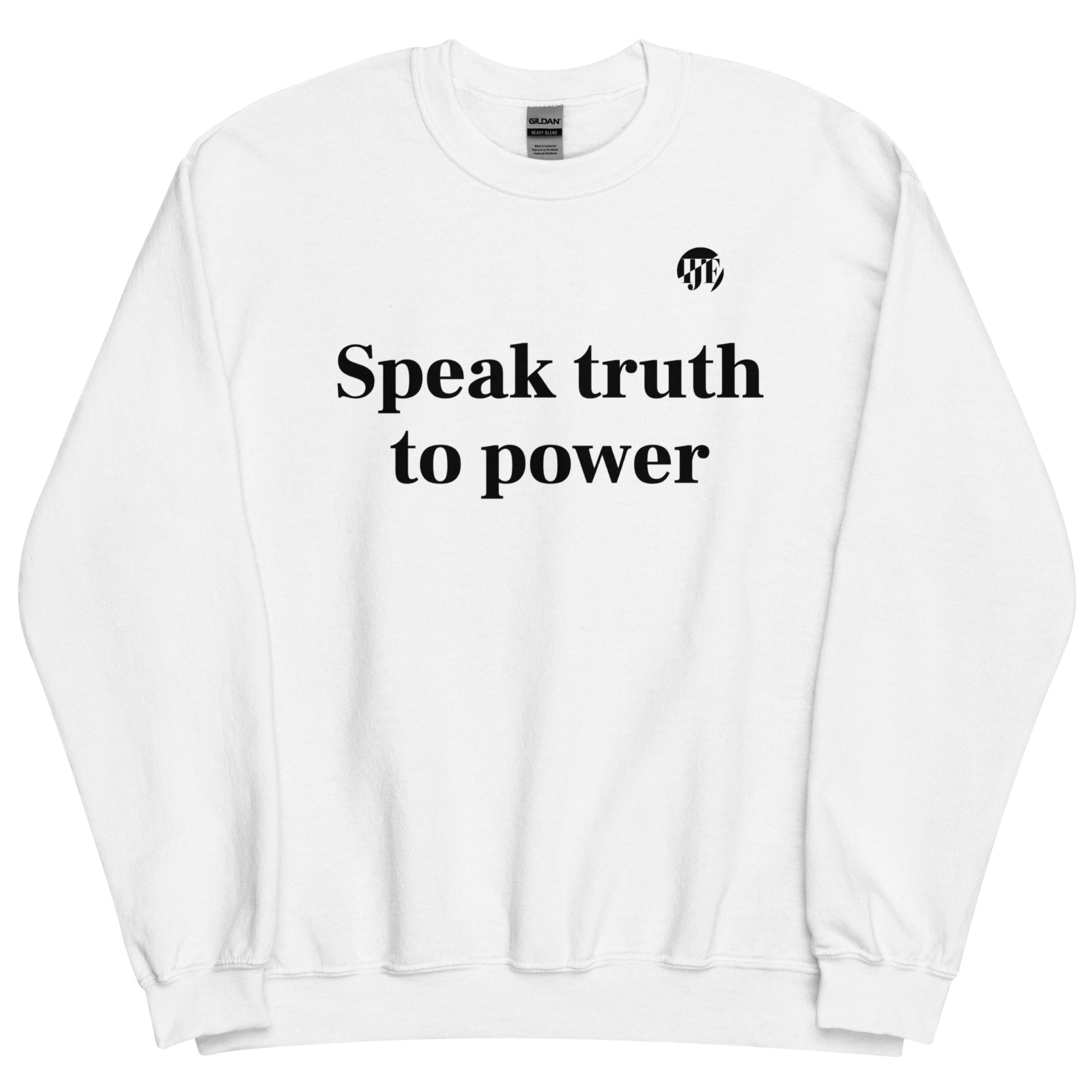 Showcase your support for data-driven investigative journalism with this unisex white sweatshirt featuring the IJF logo and "Speak Truth to Power" tagline.